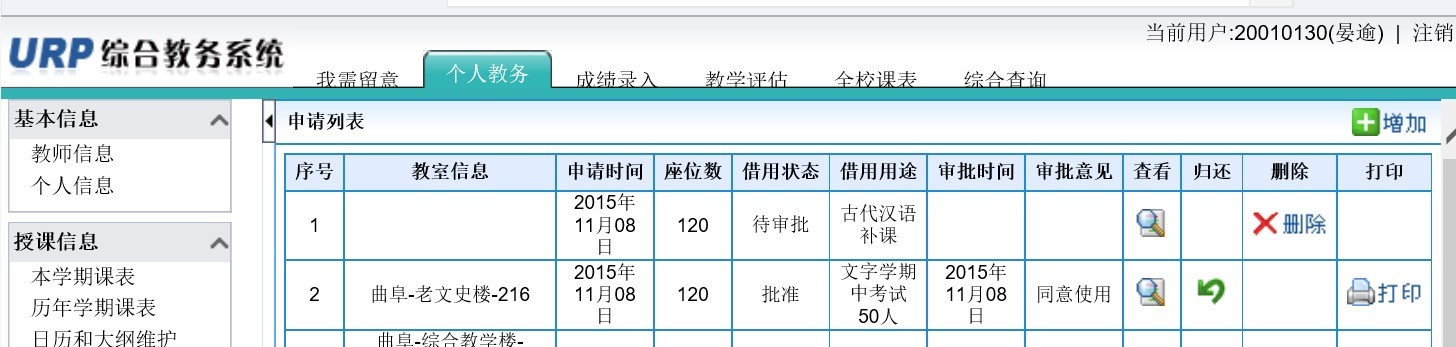 2.填写完以上项目后,点击右上角“保存”,然后电话联系教务行政科(0537-4458021、0633-3981607)进行审批操作,审批后会显示审批意见。如下图。如果申请后又不需使用,可点击“删除”(尚未审批的)或“归还”(已批准的)。